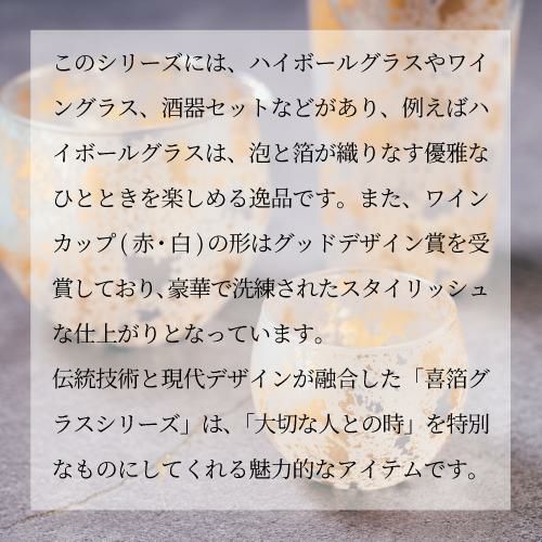 創業130余年のウチキ謹製「喜箔グラスシリーズ」は、石川県山中漆器の伝統技法「貫入」を応用。熟練職人が金箔・銀箔を散りばめ、二つとして同じ模様のない唯一無二の輝きを放ちます。グッドデザイン賞受賞のワインカップをはじめ、ハイボールグラスや酒器セットなど多彩なラインナップを展開。手仕事の美と現代デザインが融合した贅沢な逸品は、日常を特別なひとときへと昇華させます。大切な方への贈り物や迎春の器として、日本の美意識を伝える最適なアイテムです。