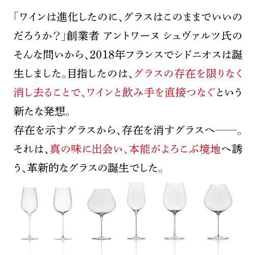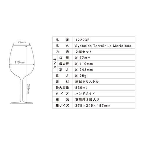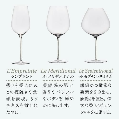 テロワールシリーズはシドニオスのグラスの中でも、より複雑な要素を持つワインをより深く味わうためのラインナップ。ル・メリディオナルは凝縮感の強い香りやパワフルなボディを鮮やかに映し出す。