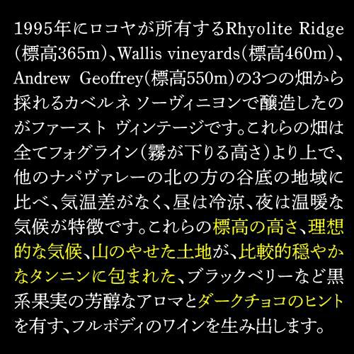 自社畑Rhyolite Ridge(標高365m) 、Wallis(標高460m)、Andrew Geoffrey(標高550m)で手摘みしたカベルネ ソーヴィニヨンを100%使用。20ヶ月フレンチオークで熟成(新樽比率98%)、無濾過、無清澄。「ダイヤモンド マウンテンからナパヴァレーの谷底の南側に向かって霧が流れているので、他の南側の地域よりブドウの生育が1日当たり、2、3時間早くなる。2016年のダイヤモンド マウンテンも十分成熟したカベルネから生まれる低音の落ち着いたテクスチャにベルギーチョコのニュアンスがある。」と醸造責任者は言います。■ワインアドヴォケイト■98点 scored by Robert Parker, Jr
