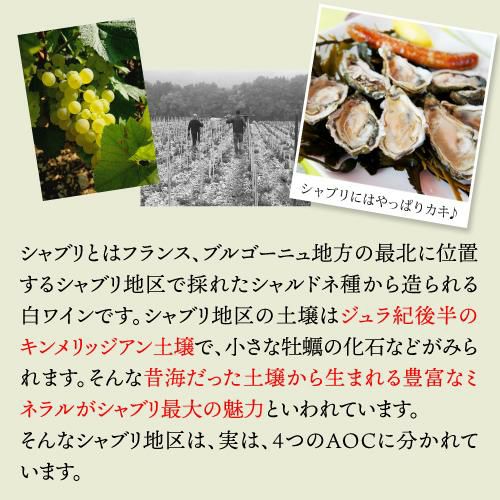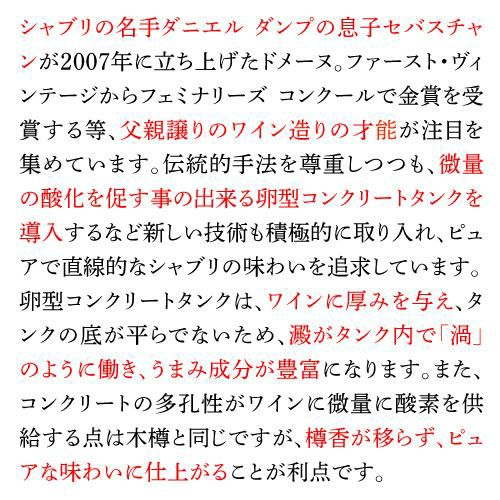 平均樹齢60年。ステンレスタンクで醸造。フローラルでシャブリらしい瑞々しいミネラルと繊細さを持つ。伝統的醸造方法。空圧式プレス機で丁寧に圧搾後、デブルバージュ。シャブリ特有のミネラルを活かす為、発酵はステンレスタンクで行う。一部のキュヴェには卵型のコンクリートタンクを使用。マロラクティック発酵。