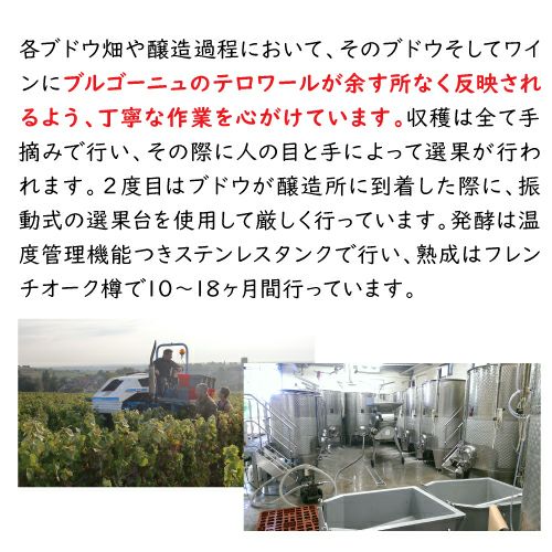 日間。木樽(新樽率20%)で15ヶ月熟成し、澱引き後に瓶詰め。