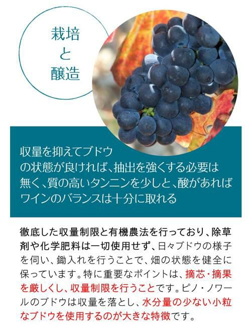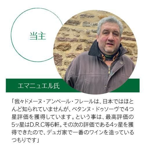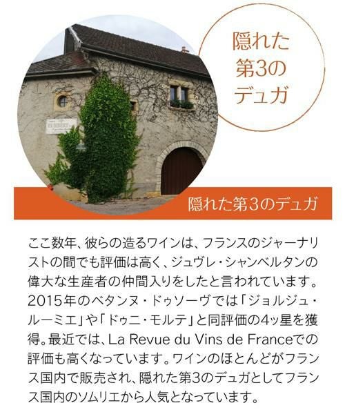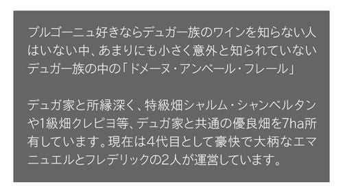 有名な評論家達が「リッチで高級、優雅、芳香」と評するほど、芳醇なワインが造られるプルミエ クリュ。プルミエ クリュ ラヴォー・サンジャックの上部に位置し、ヴァロワイユとラ・ロマネに隣接する人気プルミエクリュです。樹齢50年のブドウ樹で、畑面積は、1ha(Gevreyとbrochon村内の区画)で、粘土石灰質の土壌。50%新樽で16カ月熟成させます。プルミエ クリュの中では一番ミネラルがあり、塩のミネラル感のニュアンスや余韻がとても長いワインです。「アンベール・フレール」はブルゴーニュを代表する一族、名門デュガ家の系譜を継ぐドメーヌ。すでに世界中で名声を手に入れている同じデュガ家の「ベルナール・デュガ・ピュイ」、「クロード・デュガ」ほどの知名度はありませんが、ここ数年、彼らの造るワインは、フランスのジャーナリストの間でも評価は非常に高く、ジュヴレ・シャンベルタンの偉大な生産者の仲間入りをしたと言われています。