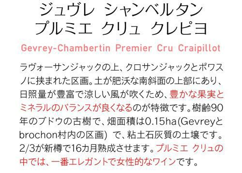 ラヴォー サンジャックの上、クロ サン ジャックとポワスノに挟まれた区画。土が肥沃な南斜面の上部にあり、日照量が豊富で涼しい風が吹くため、豊かな果実とミネラルのバランスが良くなるのが特徴です。樹齢90年のブドウの古樹で、畑面積は0.15ha(Gevreyとbrochon村内の区画) で、粘土石灰質の土壌です。2/3が新樽で16カ月熟成させます。プルミエ クリュの中では、一番エレガントで女性的なワインです。「アンベール・フレール」はブルゴーニュを代表する一族、名門デュガ家の系譜を継ぐドメーヌ。すでに世界中で名声を手に入れている同じデュガ家の「ベルナール・デュガ・ピュイ」、「クロード・デュガ」ほどの知名度はありませんが、ここ数年、彼らの造るワインは、フランスのジャーナリストの間でも評価は非常に高く、ジュヴレ・シャンベルタンの偉大な生産者の仲間入りをしたと言われています。