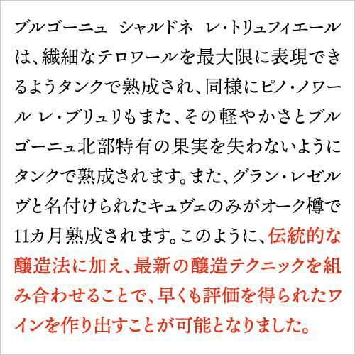 気温の上がっていない朝に収穫し、丁寧に選果。自然酵母のみを用い一切の人為的な醸造介入を行わずに、開放桶で最低限度のルモンタージュを行いながら発酵。樽で18ヶ月熟成。新樽率10%。澱引きはポンプを使わず重力のみで実施。無清澄・無濾過で瓶詰め。