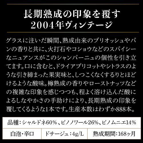 他の画像を見る クール便選択可 長期熟成の印象を覆す、2004年ヴィンテージ インフィニット エイトゴールデン エイジ [2004] 750ml正規品 辛口 シャンパン 高級シャンパン 映え シャンパーニュ 浜運A 特別価格 ¥ 44,000 税込 お気に入りに追加