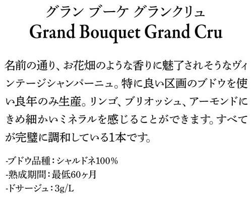 今はまだ無名に近いシュイィ村に3代続く小さな造り手。栽培は現在ビオディナミを実践しており、2020年にオーガニック認証予定。近い将来スターメゾンに変貌するかもしれない期待の新星!グランブーケは、5~6年程熟成後ようやくリリースされるグランクリュ・シュイィのシャルドネ100%のヴィンテージシャンパーニュ。