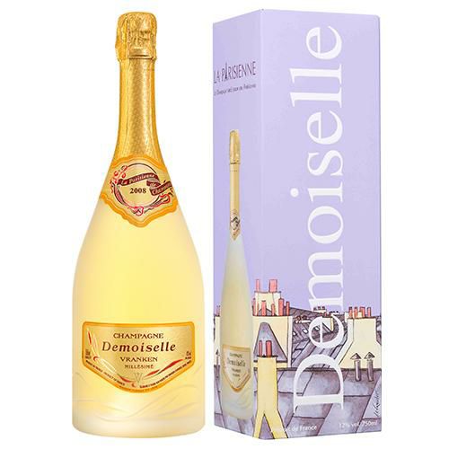 プルミエ クリュ、グラン クリュのブドウのみ使用。泡立ちは細やかでエレガント。爽やかな酸味と、はちみつ酒のような香りがあり、繊細で柔らかな余韻が長く続く。ドゥモアゼルはヴランケン・ポメリー・モノポールグループが、「エレガンスとフェミニン」をコンセプトに自社のオリジナルブランドとして開発し、1985年からリリースしているプレミアムブランド。ドゥモアゼルとはフランス語で "お嬢さん" の他に "トンボ" という意味もあり、このブランドネームは、ランスのレ・ドゥモアゼル地区にあるカステーニュ城の庭園を飛びかうトンボに由来しています。プルミエ クリュ以上の畑から厳選されたシャルドネが、やわらかでエレガントな味わいをもたらしています。