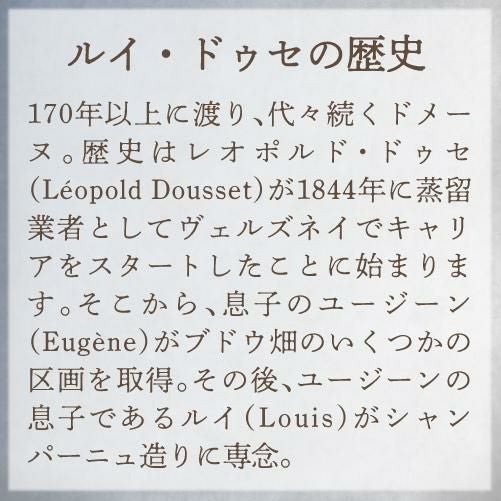 特級ヴェルズネイと6区画のピノ・ノワールとシャルドネから造られるシャンパーニュ。満開の白い花、焼き立てのパンやカリンのフレッシュな香り。口に含むと最初は柔らかで穏やかな印象から、しっかりとブドウの果実味が感じられます。ドサージュは0g/L。極辛口のイキイキとした酸が感じられます。リュット・レゾネ(ビオへ転換中)で栽培された平均樹齢52年のブドウを使用。卓越した優美さを求めるルイ・ドゥセ。ピノ・ノワールとシャルドネのみを栽培し個性の異なる2品種のフレッシュさと力強さ、エレガントさとアロマティックさをもたらすと考えています。ビオディナミの考え方をベースにリュット・レゾネ(減農薬栽培)を実施。※今後ビオへ転換予定◆受賞歴◆ジルベール・ガイヤール2014 金賞