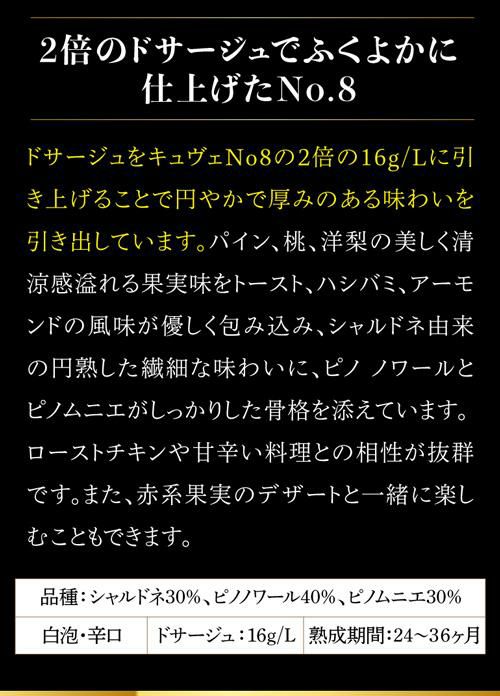 ドサージュをキュヴェNo8の2倍の16g/Lに引き上げることで円やかで厚みのある味わいを引き出しています。パイン、桃、洋梨の美しく清涼感溢れる果実味をトースト、ハシバミ、アーモンドの風味が優しく包み込み、シャルドネ由来の円熟した繊細な味わいに、ピノ・ノワールとピノムニエがしっかりした骨格を添えています。