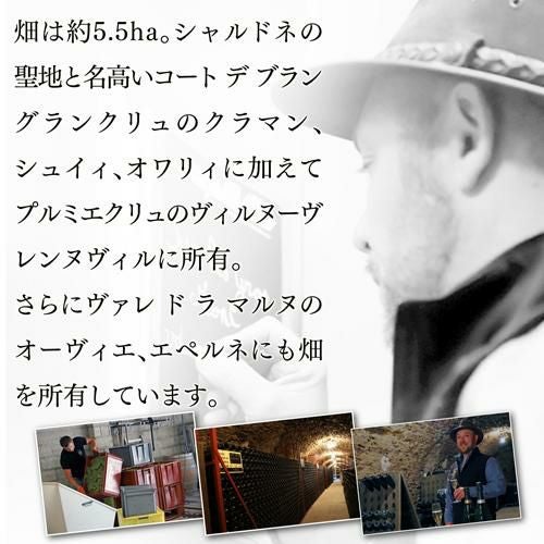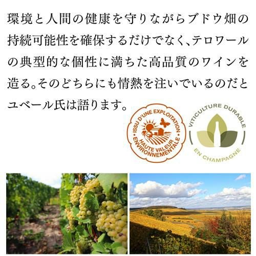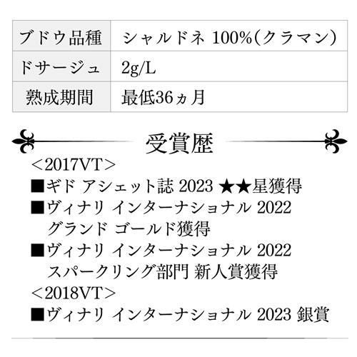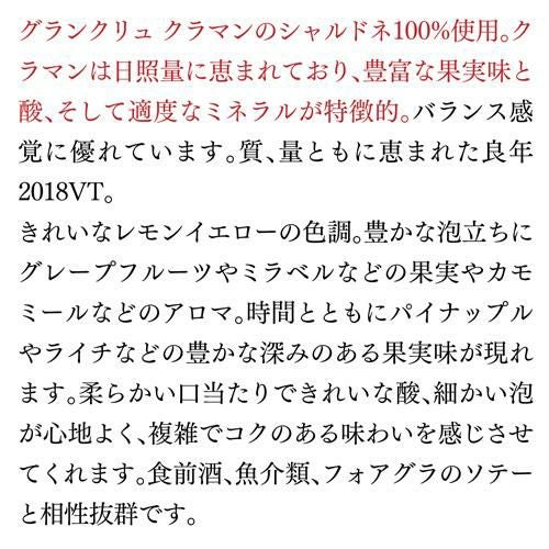 グランクリュ クラマンのシャルドネを100%使用。きれいなレモンイエローの色調。豊かな泡立ちにグレープフルーツやミラベルなどの果実やカモミールなどのアロマ。時間とともにパイナップルやライチなどの豊かな深みのある果実味が現れます。アヴィズやルメニルのような張り詰めたシャープな酸ではなく、ミネラリーながらもきれいな酸。程よいコク、柔らかい口当たりが感じられ、バランスよくまとまっています。
