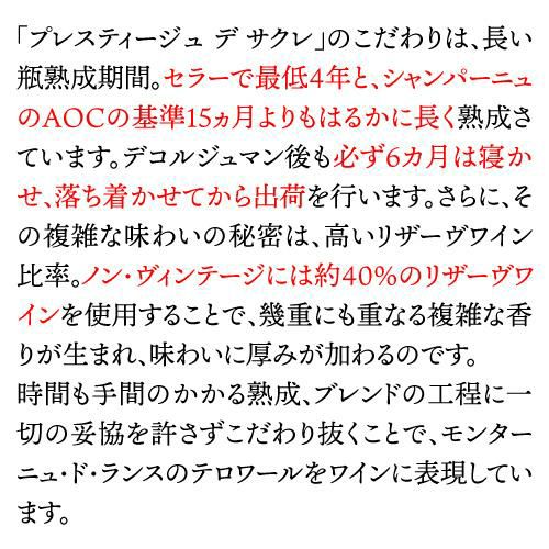 他の画像を見る クール便選択可 フルーティーで刺激的 成果を体現した単一ヴィンテージ プレスティージュ デ サクレキュヴェ グルナ ミレジメ 2015 750mlモンターニュ ド ランス ジャンヴリー ミレジム シャンパン 辛口 シャンパーニュ 浜運 特別価格 ¥ 15,400 税込 お気に入りに追加