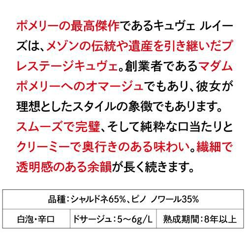 他の画像を見る クール便選択可 ポメリーが造る最高傑作“ルイーズ” ポメリー キュヴェ ルイーズ 2006 750ml正規品 シャンパン シャンパーニュ シャルドネ ピノ ノワール 辛口 浜運 特別価格 ¥ 23,980 税込 お気に入りに追加