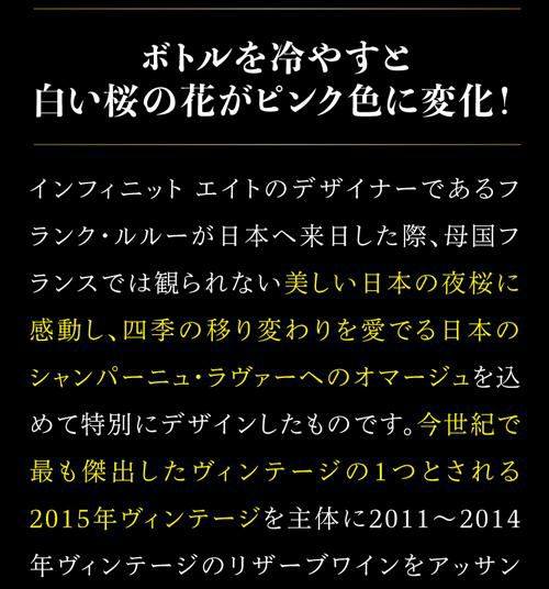 他の画像を見る クール便選択可 サクラアワード2023ゴールド受賞ボトルを冷やすと白い桜の花がピンク色に変化! インフィニット エイトキュヴェ ブロッサム ブリュット NV 箱付 BOX 750ml 正規品モンターニュ ド ランス シャンパン 辛口 シャルドネ ピノノワール ムニエ シャンパーニュ 虎 特別価格 ¥ 19,800 税込 お気に入りに追加 在庫切れ