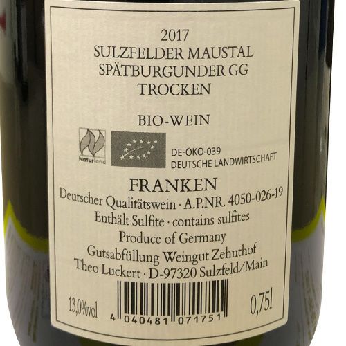 ツェーントホーフ ルッカート マウスタル シュペートブルグンダーGG 2017 750ml ドイツ フランケン 辛口 グローセス ゲヴェックス Groses Gewachs 赤ワイン ビオ BIO 虎