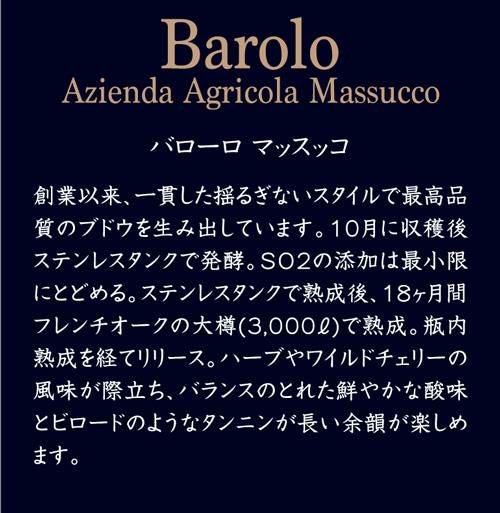 他の画像を見る クール便選択可 ワインの王と称され長期熟成に耐える重厚かつ深遠な味わい! バローロ DOCG マッスッコ 2020 750ml イタリア ピエモンテ 赤ワイン 浜運 特別価格 ¥ 9,350 税込 お気に入りに追加