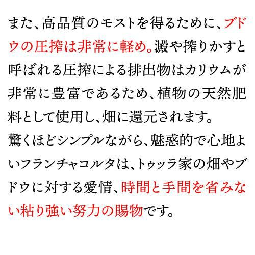 家族経営ワイナリー「トゥッラ」はブドウの栽培、醸造から流通に至るまで一貫して管理する、いわばフランチャコルタのRM。収量を抑え良質なブドウを得て、さらには極力圧力を加えない圧搾を行ったうえで、良質なモストを得ます。微細な泡を伴う輝きのある金色。グレープフルーツのシロップ漬け、マンゴーなどのフルーティーなアロマと、ピスタチオやヘーゼルナッツ、ミモザのノート。泡はクリーミーで、全体にミネラル感があり、しっかりとした酸が全体を引き締める印象的な構造です。