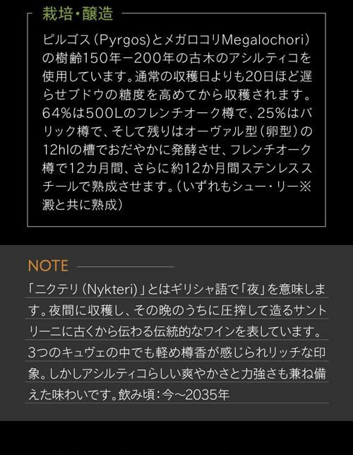 2021年初リリースのキュヴェ「ニクテリ(Nykteri)」エステートアルギロスの古くからある、伝統的なサントリーニスタイルのワインです。ピルゴス(Pyrgos)とメガロコリ(Megalochori)の樹齢150年以上の非常に古いアシルティコのブドウの樹を厳選し、熟した日から約20日後のよく熟れた状態で収穫します。64%は500Lのフレンチオーク樽で、25%はバリック樽で、そして残りはオーヴァル型(卵型)の12hlの槽でおだやかに発酵させ、フレンチオーク樽で12カ月間、さらに約12か月間ステンレススチールで熟成させます。(いずれもシュー・リー※澱と共に熟成)力強さがありながらも、荒々しさを一切感じさせず、飲みごたえのあるワインです。数年の瓶内熟成が必要で、15年以上の熟成が期待できます。
