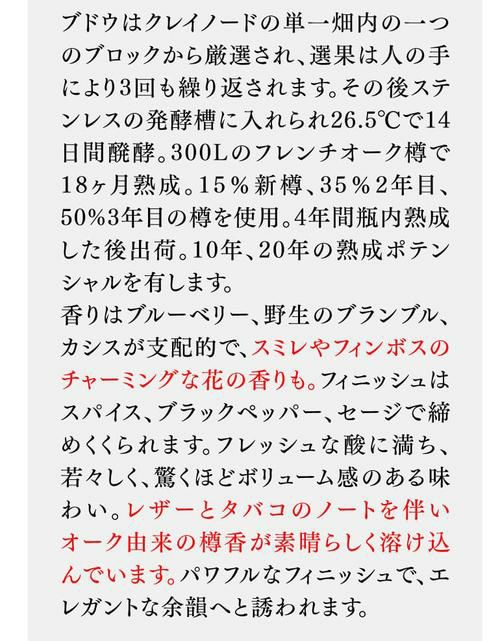 1688年に南アフリカに渡ったフランス人により設立されたブティックワイナリーで、現在はその子孫のジェラール・ド・ヴィリエール氏が当主。アンティノリの元醸造長であり、テスタマッタをリリースするやいなや世界を驚かせ、さらにはカリフォルニアのオー・ボン・クリマのコンサルタントもこなす天才醸造家アルベルト・アントニーニ氏がコンサルを務めていたことでも有名です。 香りはブルーベリー、野生のブランブル、カシスが支配的で、スミレやフィンボスのチャーミングな花の香り。フィニッシュはスパイス、ブラックペッパー、セージで締めくくられます。フレッシュな酸に満ち、若々しく、驚くほどボリューム感のある味わい。レザーとタバコのノートを伴いオーク由来の樽香が素晴らしく溶け込んでいます。パワフルなフィニッシュで、エレガントな余韻へと誘われます。 300Lのフレンチオーク樽で18ヶ月熟成。15%新樽、35%2年目、50%3年目の樽を使用。4年間瓶内熟成した後出荷。
