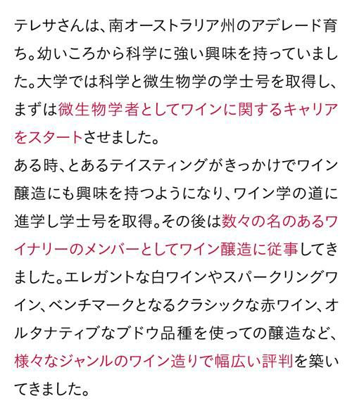 南オーストラリア州アデレード育ちで、南オーストラリア大学で化学と微生物学の学士号を取得した、テレサ ヒューゼンローダー女史が醸造を担当。20年以上に渡り技術を磨いてきた彼女のワイン造りに対する姿勢は、エレガントでフィネスとバランスが取れた「その土地らしさを伝えるワイン造り」にて表現されています。