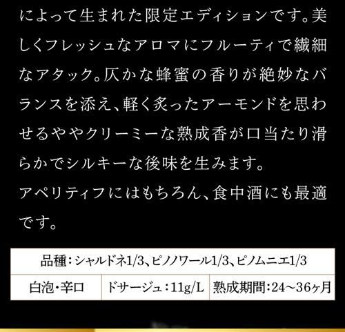他の画像を見る クール便選択可 イタリア人が造るシャンパーニュの24ヶ月熟成キュヴェ エンクリブリュット ブラン ド ブラン グランクリュ 24mth 750mlコート デ ブラン ル メニル シュール オジェ 24ヶ月熟成 シャンパン 辛口 シャンパーニュ 浜運 特別価格 ¥ 11,880 税込 お気に入りに追加