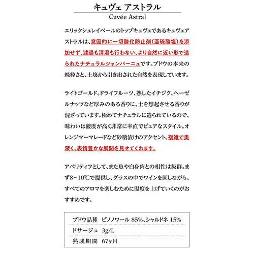 他の画像を見る クール便選択可 ビオディナミの先駆者が手掛けるナチュラル・シャンパーニュ! エリック シュレイベールキュヴェ アストラル 750mlコート デ バール 酸化防止剤無添加 ナチュラル 自然派 オーガニック ビオ シャンパン 辛口 シャンパーニュ 浜運 特別価格 ¥ 38,500 税込 お気に入りに追加