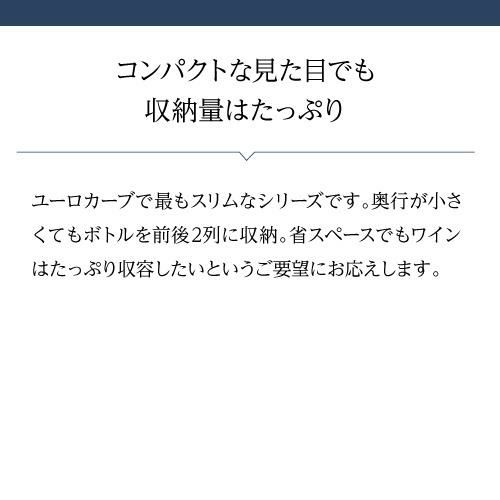 ユーロカーブで最もスリムなシリーズです。奥行が小さくてもボトルを前後2列に収納。省スペースでもワインはたっぷり収容したいというご要望にお応えします。