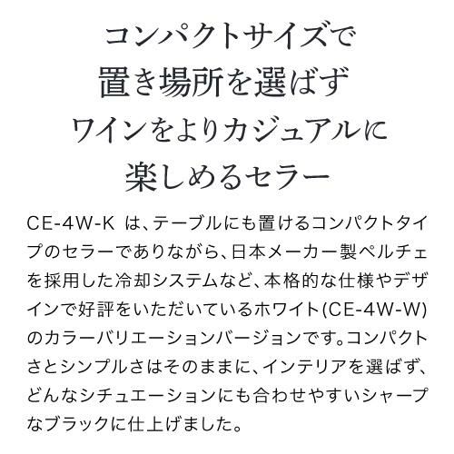 他の画像を見る テーブルにも置けるコンパクトセラー デバイスタイル CE-4W-K 本体カラー:ブラック 4本 ワインセラー 家庭用ワインセラー 送料無料 deviceSTYLE ペルチェ式 コンパクト 当店通常価格 オープン価格 特別価格 ¥ 24,799 税込 お気に入りに追加
