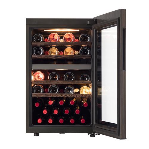 ウッドブラウンの外観とよくマッチした木製飾りの付いたスライド式ワイヤーラックを標準装備。木のリアルな質感と手触りが愉しめるのもポイントの一つ。ワインボトルを手前と奥の二列配列とし、コンパクトなサイズに比して余裕のある収容本数を確保。スライド式ラックは半分まで引き出せるようにし、安全性を確保しながらも奥のワインボトルが取り出しやすい設計にしました。