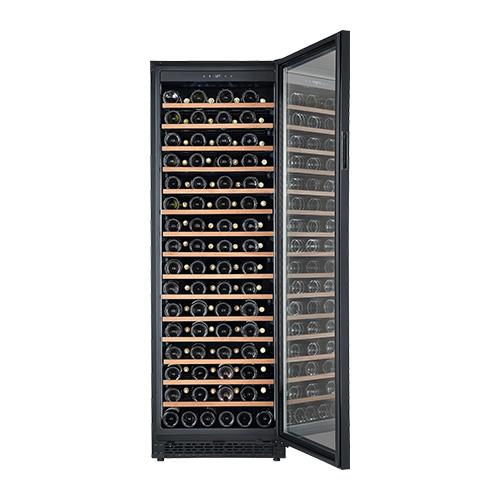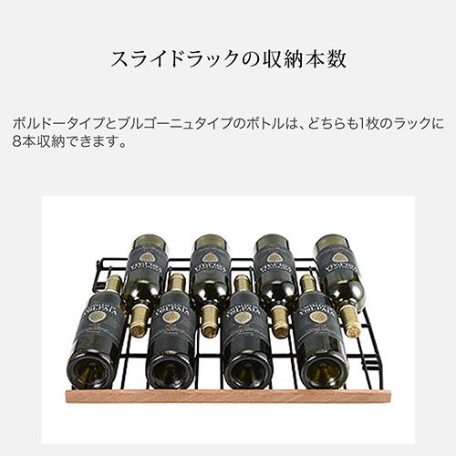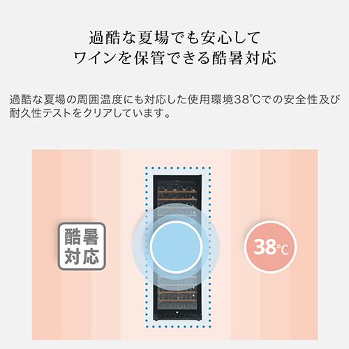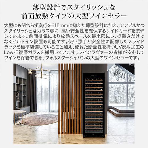 薄型設計でスタイリッシュな前面放熱タイプの大型ワインセラー 大型にもかかわらず奥行を615mmに抑えた薄型設定に加え、シンプルかつスタイリッシュなガラス扉に、高い安全性を確保するサイドガードを装備しています。前面排気により放熱スペースを最小限にし、据置きだけでなくビルトイン設置も可能です。使い勝手と安全性に配慮したスライドラックと標準装備していることに加え、優れた断熱性を持つUV反射加工のLow-E複層ガラスを採用しています。ワインラヴァーの皆様が安心してワインを保管できる、フォルスタージャパンの大型ワインセラーです。 設置場所の選択肢が広がる薄型設計 収納本数126本の大型ワインセラーでありながら、奥行きは同じ収納本数のモデル中でも最薄レベルの615mmに抑えました。この薄型設定により、これまで設置が難しかった場所にも置けるようになり、設置場所の選択肢が広がります。 シンプルでスタイリッシュなガラス扉に安全性の高いサイドガードを搭載 スタイリッシュな外観デザインは、モダンなシステムキッチンや、オープンキッチンのレストランにもしっくり馴染みます。また、横からの衝撃に弱いガラス扉の耐久性を高めるために、サイドガードを搭載することで安全性を高めました。 前面排気により放熱スペースを最小化することで、据え置きだけではなくビルトインも可能に FJP-366GS(BK)は放熱を本体前面から行うことで、必要な放熱スペースを左右5mm、背面5mm、上部5mm(※)に抑えました。通常のワインセラーのように据え置きとしての使用はもちろん、ビルトインとしても使用できます。(※フォルスタージャパンの通常の製品に必要な放熱スペースは左右20mm、背面50mm、上部100mm) 取り外しが容易なストッパー付きスライドラックと、引き出しが容易なレール式スライド式ラックを交互に配置 FJP-366GS(BK)は2種類のスライドラックを交互に配置しています。最上段から数えて奇数の棚には、取り外しのしやすいストッパー付きのスライドラックを配置することで、太めのボトルを保管する際に棚を簡単に外して使用することができます。また偶数の棚には引き出しやすさを重視したレール式スライドラックを配置しています。(※棚の引き出し具合は奇数棚が手前4割程度、偶数棚が手前半分程度となります) 木製棚飾りには高級感のあるサペリ材を使用 木製の棚飾りには、温かみのある印象と高級感溢れる美しい色合いが人気のサペリ材を使用しています。サペリ材はその耐久性と加工のしやすさから、高級家具や楽器製作などにも広く使用されています。 庫内を両サイドから照らすバータイプのLED照明 庫内天面のLED照明に加え、庫内手前側の両サイドに配置されたバータイプのLED照明が、自慢のワインコレクションを美しく照らし出します。 過酷な夏場でも安心してワインを保管できる酷暑対応 過酷な夏場の周囲温度にも対応した使用環境38℃での安全性及び耐久性テストをクリアしています。 寒い冬場でも庫内温度の低下を抑制する加温ヒーター 外気温が低い冬場は庫内の温度が下がりすぎることも。FJP-366GS(BK)は加温ヒーター付きなので、過度な庫内温度の低下を抑制し、大切なワインを低温劣化から守ります。 庫内の温度上昇と湿度低下を抑制するファン式冷却方式 ファンモーターにより加湿冷気を強制循環させて温度や湿度管理に有効なファン式冷却方式を採用しています。また扉開閉時にはファンをモーターを停止させて外気流入をできる限り防ぎ庫内の温度上昇と湿度低下を抑制しています。 棚を間引くことで最下段にはワインだけではなく日本酒を立てて保管することも可能 棚を間引いて最下段を広く取ることで、日本酒の一升瓶や四合瓶を立てて保管することができます。FJP-366GS(BK)は設定可能温度が5℃~20℃のため、日本酒の雪冷え(6℃程度)、花冷え(10℃程度)、涼冷え(15℃程度)のいずれにも対応可能です。(※庫内最下段にはワイン収納用の凹凸があるため、立てて保管する際は薄い板やスチレンボードなどを置いてご使用ください) 断熱性に優れたUV反射加工のLow-E複層ガラスを搭載 ガラス表面に特殊な膜をコーティングすることで断熱性を高めたLow-E複層ガラス(3層)を搭載することで、ガラスを通じた庫内への熱の侵入を抑制します。またUV反射加工により紫外線からの影響も抑制します。 扉下がり防止サポート装備なので安心 3重の複層ガラスはどうしても重量がかかりますが、ドア下がり防止サポートを装備することで、ガラスの重みで扉が傾くことを防止します。 温度変化によるワインへの刺激を最小限に抑える1温度タイプ 庫内を一定の温度で管理するのが1温度タイプのワインセラーです。1温度タイプは構造上、2温度タイプに比べて庫内の温度のバラつきが少なく温度変化が安定しているため、普段飲みのワインの品質をより確実に維持したい方や、長期熟成向きのワインをお持ちの方にお勧めです。 スライドラックの収納本数 ボルドータイプと