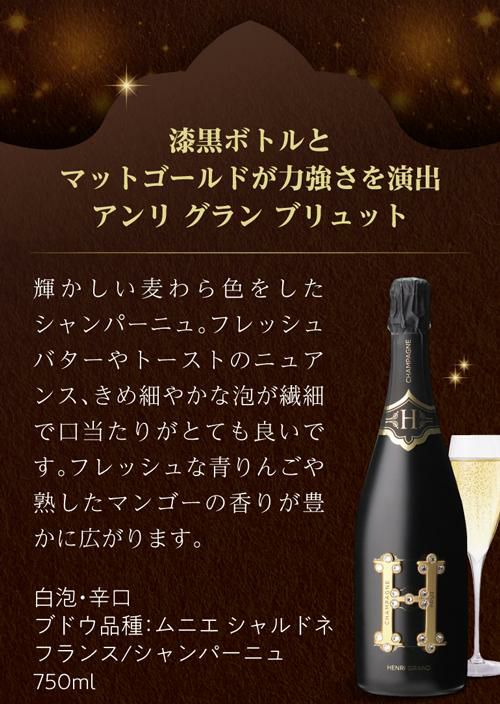 他の画像を見る アンリ グラン ブリュット 750ml 辛口 ヴァレ ド ラ マルヌ 高級 ピノ ムニエ シャルドネ シャンパーニュ 長S メーカー希望小売価格 ¥ 26,400 特別価格 ¥ 21,780 税込 お気に入りに追加
