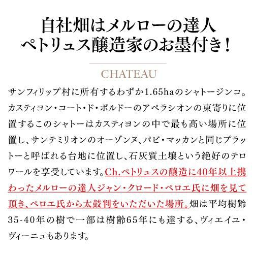 他の画像を見る 日本人初のボルドー女性醸造家のトップキュヴェ 21ヴィンテージ シャトージンコ 2021カスティヨン コート ド ボルドー 750mlフランス メルロー 女性醸造家 百合草梨沙 オーガニック認証 ビオ 赤ワイン 辛口 浜運 特別価格 ¥ 14,850 税込 お気に入りに追加 在庫切れ